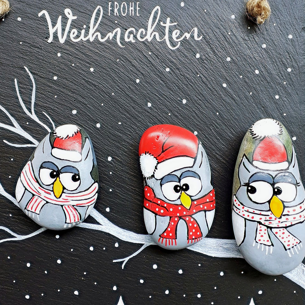 Deko-Schild, Frohe Weihnachten, Eulen mit Mütze & Schal auf Stein gemalt